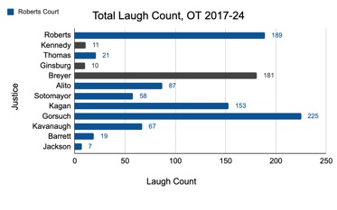 And indeed, quantifying humor at the Supreme Court is not a novel endeavor. Legal scholars – who have acknowledged that they have some free time on their hands – have, in terms past, pored over the moments marked unceremoniously as “(Laughter.)” on argument transcripts.
